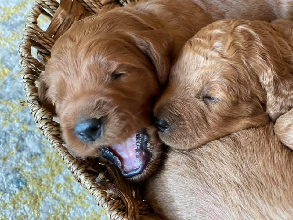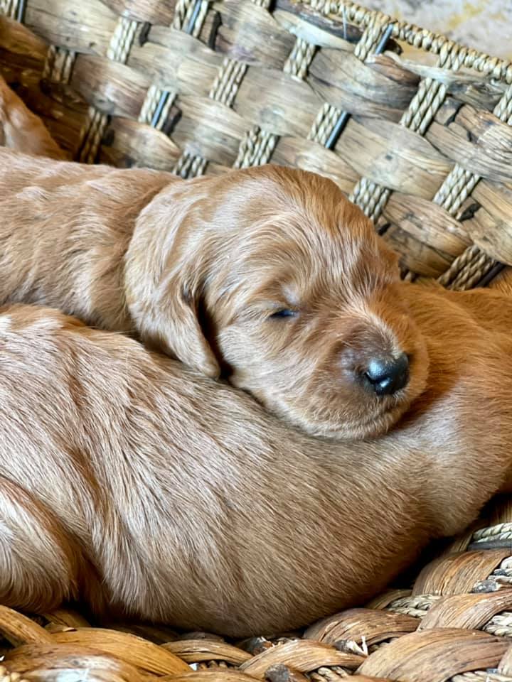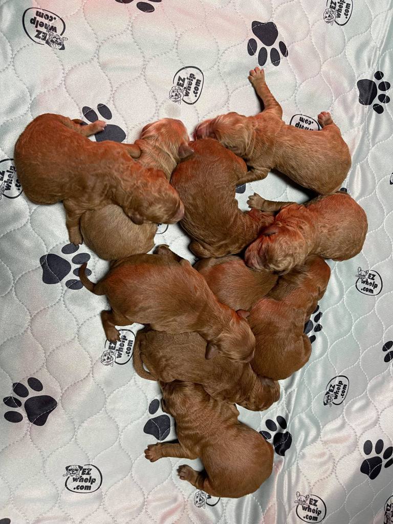 Puppies are raised indoors in a facility that is regularly sanitized. They are weighed regularly to ensure they grow and thrive. Puppies will receive preventative wormer at 3 & 5 weeks old. They will be vet checked at 7 weeks old and receive their first set of vaccines. They are played with daily and well socialized!