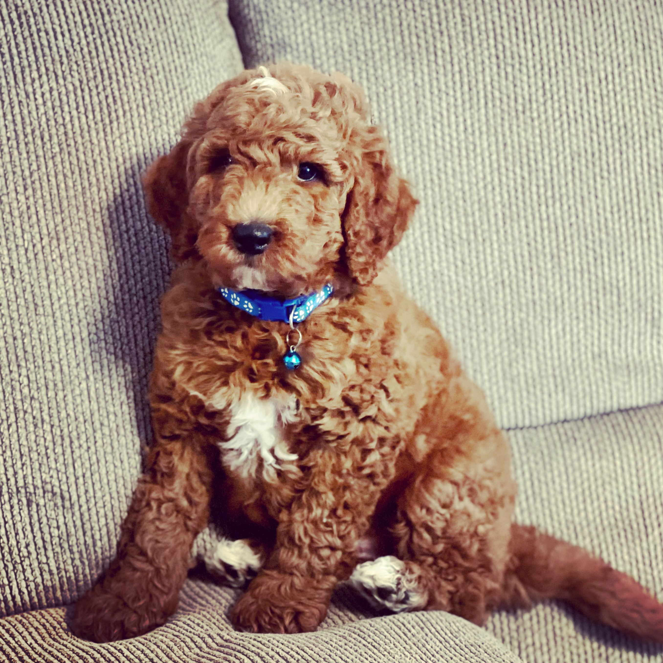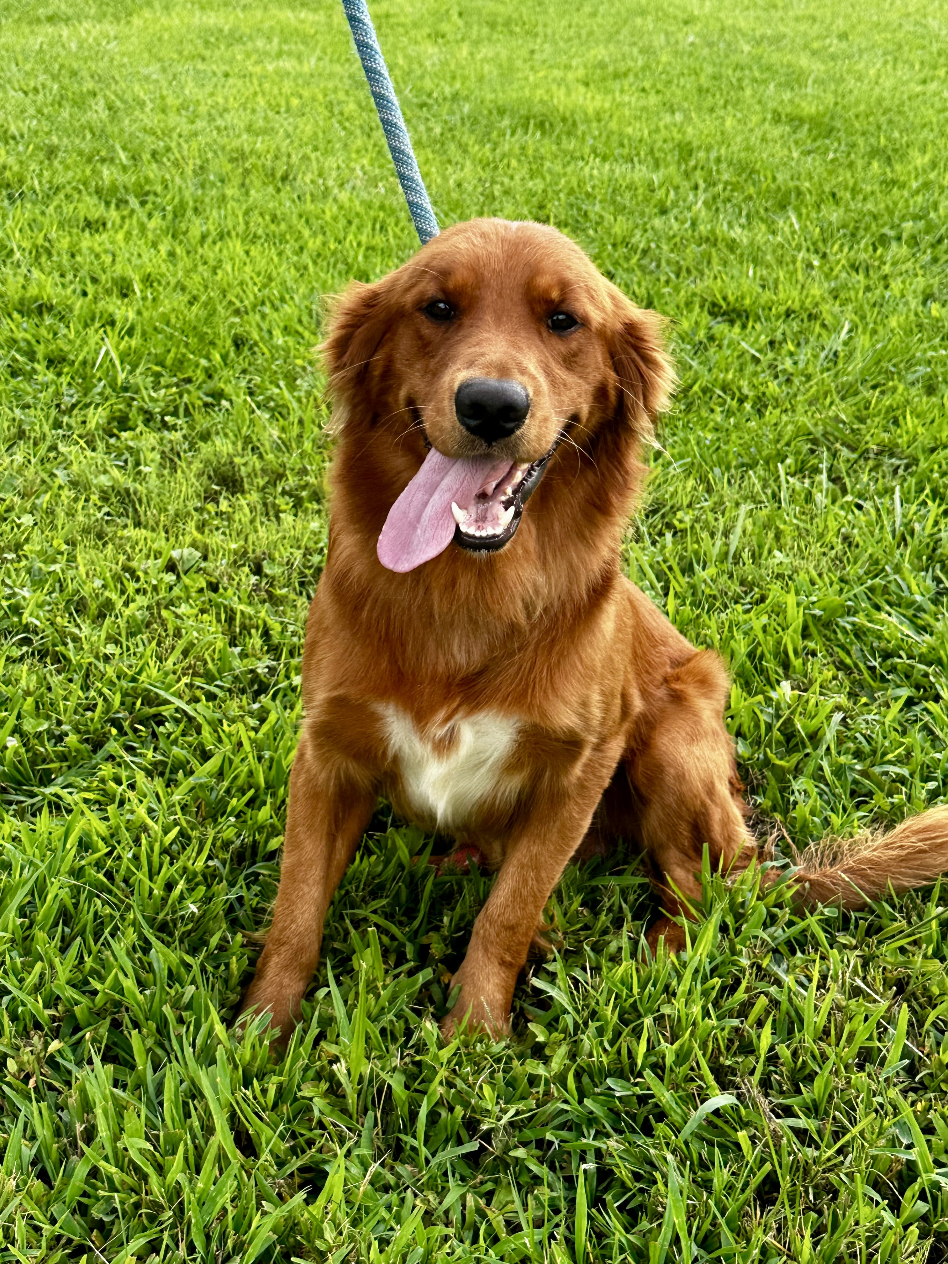 He is a sweet and funny boy who loves to play! He has a dark golden coat with a white splash on his chest, a fun trait he passes on to some of his puppies!